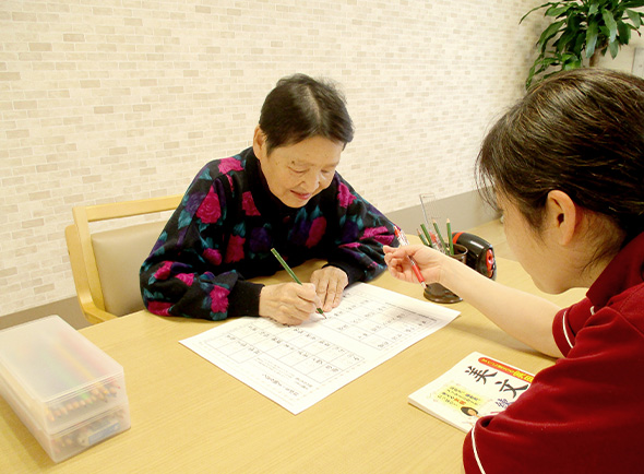「読み書き」「計算」などの「脳トレ」、体を使った体操や運動で「リハビリ」、ご利用者様とコミュニケーションを取りながら認知症の予防・改善に力を入れています。